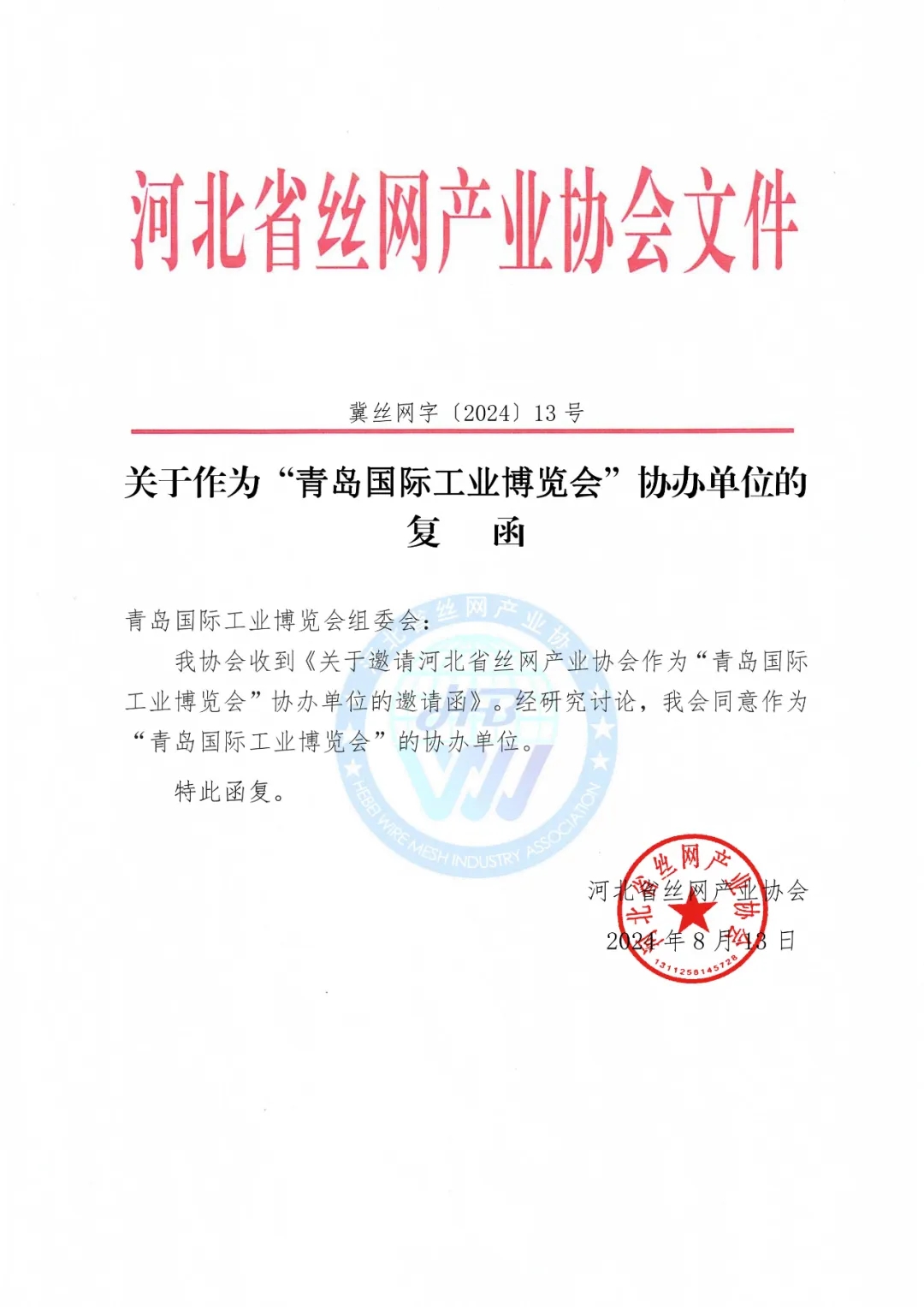由中國機械工業(yè)聯(lián)合會、山東省機械工業(yè)科學技術協(xié)會、濟南市機器人與高端裝備產(chǎn)業(yè)協(xié)會、新丞華國際會展(山東)集團有限公司共同主辦的青島國際工業(yè)博覽會在青島西海岸新區(qū)青島世界博覽城舉辦。河北省絲網(wǎng)產(chǎn)業(yè)協(xié)會應主辦方邀請,同意作為“青島國際工業(yè)博覽會”的協(xié)辦單位,共同助力推進高端裝備發(fā)展,全力打造制造業(yè)領域貿易平臺,助力制造強國建設。