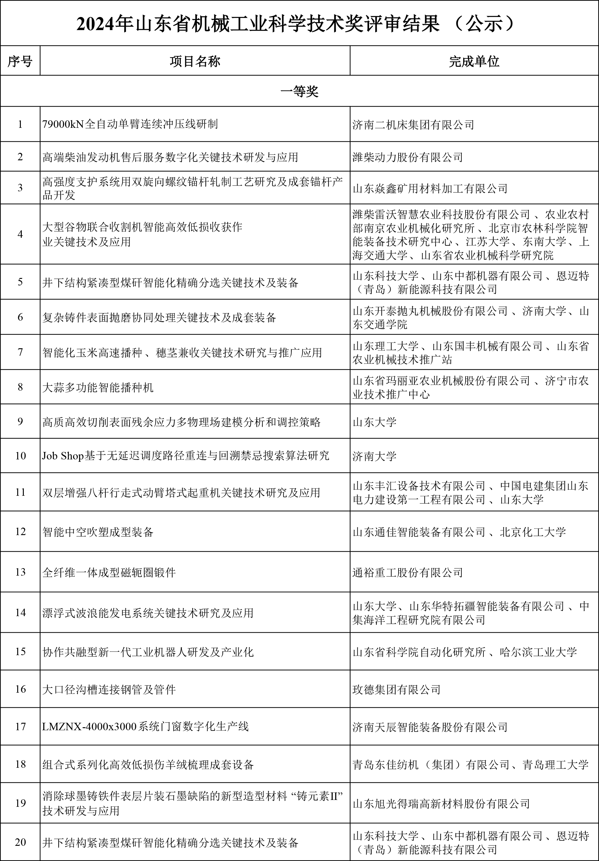 據悉,2024年山東省機械工業科學技術獎評審工作已于2024年9月評審結果公布,本年度共計受理項目655項,經省機械工業科學技術獎評審委員會評審、表決通過,共計評定出:一等獎97項,二等獎162項,三等獎183項,獎項合計442項。